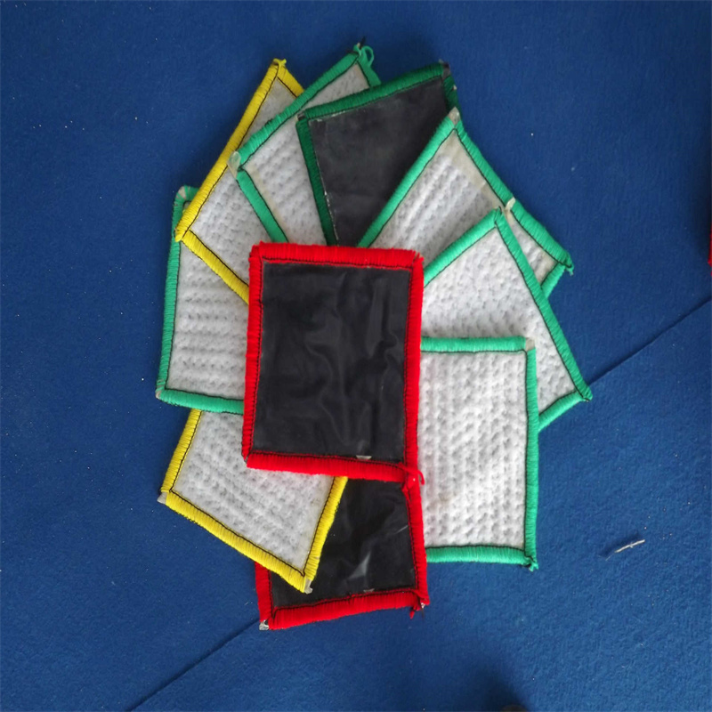 9、如果膨润土毯在安装过程在损坏(撕裂、刺穿等),可以从一卷新的膨润土毯上切割一块“补丁”盖在破损的地方来进行修补。补丁的四边距离破损的地方长度不能小于300mm,铺放“补丁”前应在破损周围撒一些颗粒状膨润土或膨润土浆。如有必要也可以使用一些粘合剂以防止“补丁”移位,或者在破损的地方下面垫一小块膨润土毯。
